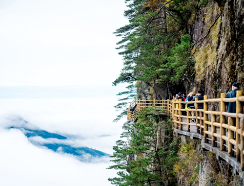 采风团乘坐观光缆车徐徐上山,走过星月洞,来到明月山特色高山景点青云栈道。。