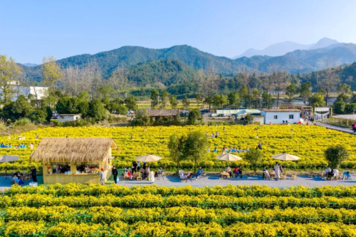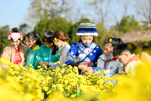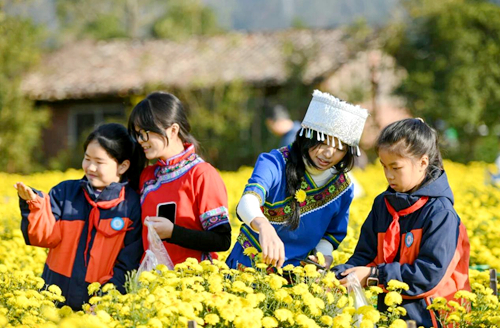 随后,各民族青少年代表到温汤镇大滋然菊花基地,在金秋暖阳中开启沉浸式采菊体验。在基地负责人的指导下,各民族青少年协同合作,兴致盎然地投入劳作。花田间,既有对采摘技巧的认真请教,也有对菊花品种的趣味交流,欢声笑语与浓郁菊香交织,汇成一幅民族团结的生动画卷。